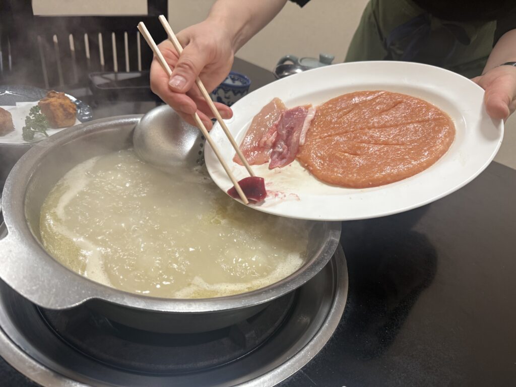 席に着くと、まずは湯呑みに注がれたスープから。塩とネギを少し足すだけで、体に染み渡るような深い鶏の旨味に驚かされます。
